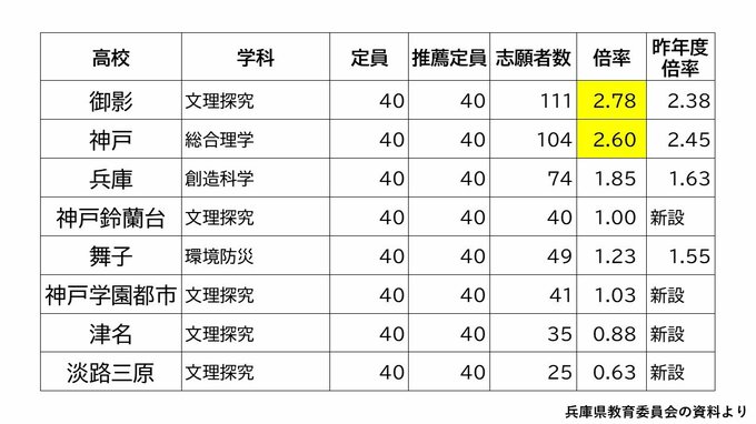 最も倍率が高いのが、御影高校の文理探究で2.78倍、去年の2.38倍よりも高くなりました。続いて神戸高校の総合理学、定員40人に対し104人が応募する2.60倍、神戸も去年の2.45倍より高くなりました。