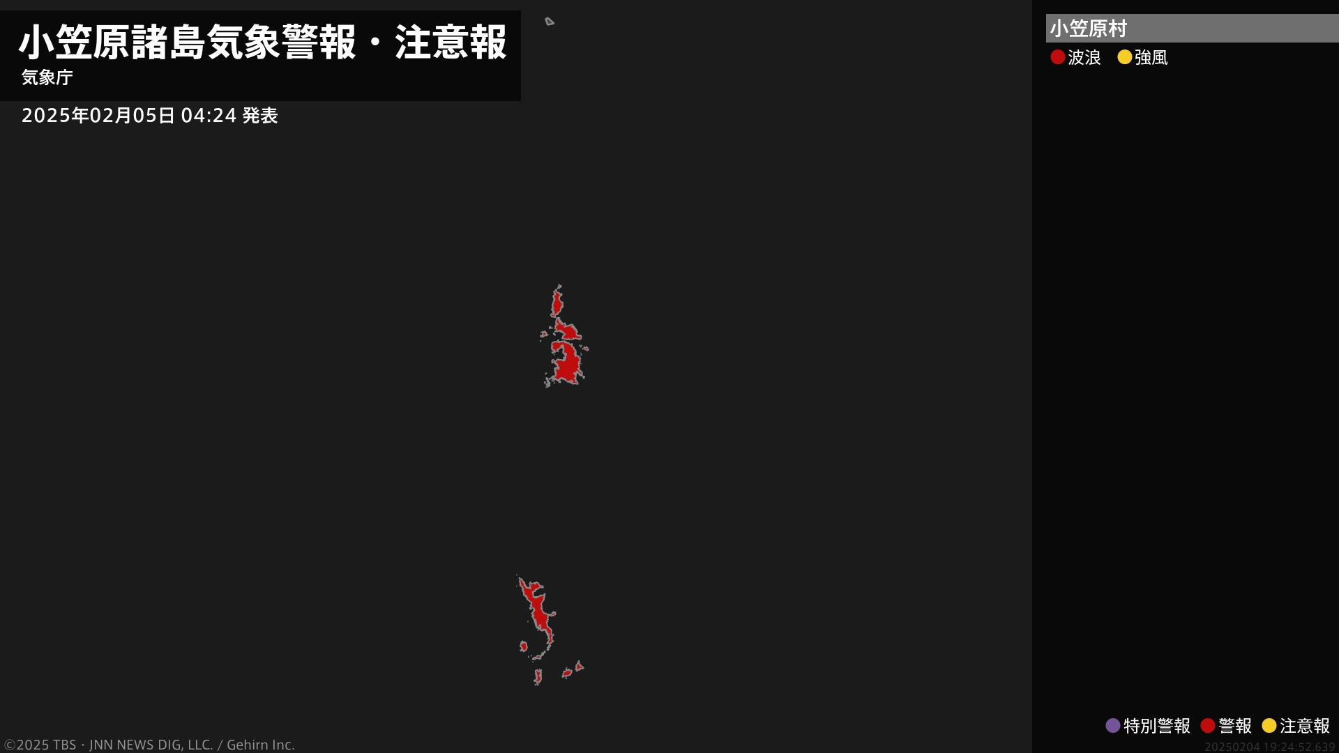 気象台は、午前4時24分に、波浪警報を小笠原村に発表しました。