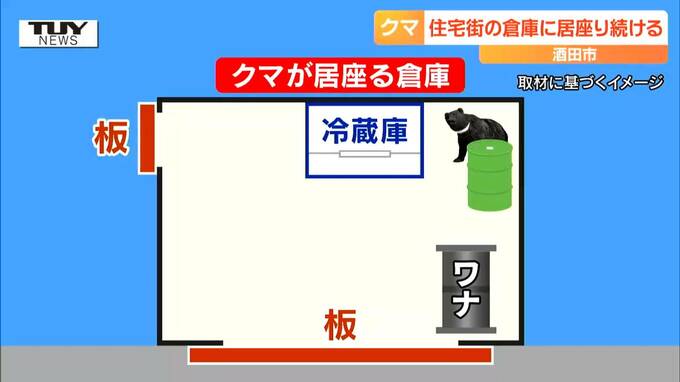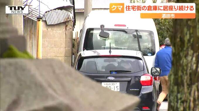 クマは3日に市内の住宅地で目撃され、酒田市安田の住宅の小屋に入った。警察と市、猟友会などが小屋に箱ワナを設置し、周囲を包囲した。