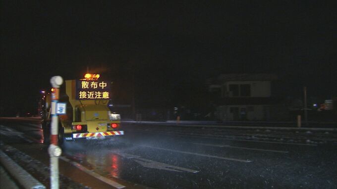 記者「今、パーの標識を過ぎました。薬剤散布車から散布剤が道路にまかれ始めました。そして、グーの標識を過ぎるとすぐさま散布車から凍結有防止剤が止まりました」