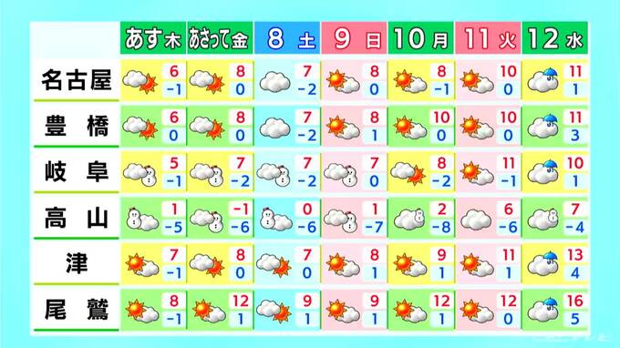 最高気温は名古屋・豊橋・岐阜で6℃と4日よりもさらに寒さが強まるでしょう。暖かい服装でお過ごしください。