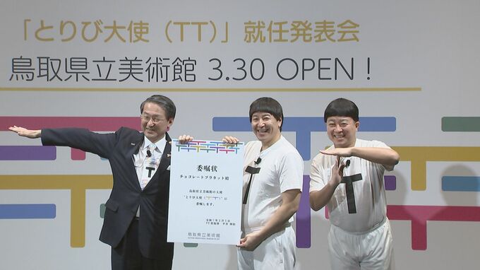 3月30日に開館する「鳥取県立美術館」の応援大使「とりび大使」として、お笑いコンビのチョコレートプラネットが就任。発表式に平井伸治 鳥取県知事とともに登場しました。