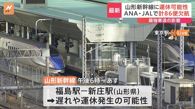 日本海側を中心に強まる雪や風によって交通機関にも影響が出ています。JR東日本によりますと、山形新幹線はきょう午後6時ごろからあすにかけ、福島駅から山形県の新庄駅間で、遅れや運休が発生する可能性があると…
