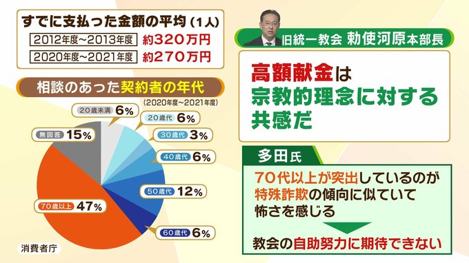 「(相談した世代で)70代以上が突出していているのはまるで特殊詐欺の傾向に似ていて、怖さを感じました。教会の自助努力に期待はできないと思います。70代の親の資産を狙っているのか、子どもが献金をしてしまっての相談なのか、詳しい内容はわからないですが、
