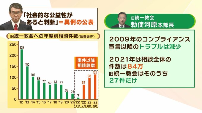 ーー消費生活センターなどに寄せられた旧統一教会への相談件数が公開されました。2012年から相談件数は減少しましたが、安倍元総理の銃撃事件以降にぐっと増えてきているという状況です。以前の会見で、勅使河原本部長は2009年のコンプライアンス宣言以降トラブルは「1件もない」と話していましたが、10月4日の会見では『相談件数は非常に少ない』と話しました。2020年~2021年度に相談があった契約者の年代は、70代以上が47%ということです。こうしたデータから『年配の方がピンポイントで狙われてるのではないか』ともみてとれます。勅使河原本部長は、『高額献金は宗教的理念に対する共感だ』と話しましたが、この状況をどう思われますか?