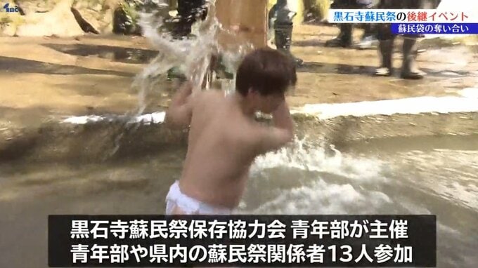 これまでと同様、近くを流れる瑠璃壺川で水をかぶり身を清めたあと、黒石寺を参拝する「夏参り」が終わると、場所を移して五穀豊穣にご利益があるとされる蘇民袋の争奪戦です。