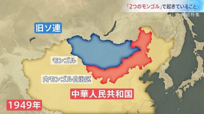 1924年、北部は旧ソ連の支援を受けて独立。漢族の入植が進んでいた南部は1949年、中華人民共和国の建国に伴い、現在の「内モンゴル自治区」となった。