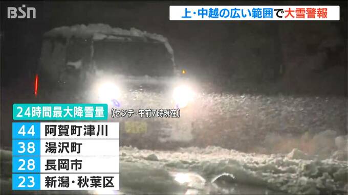 6日朝までの24時間降雪量は阿賀町津川で44センチ、長岡市で28センチ、新潟市秋葉区で23センチなどとなっています。6日午前7時50分現在、上越の全域と中越の広い範囲に大雪警報が出されています。