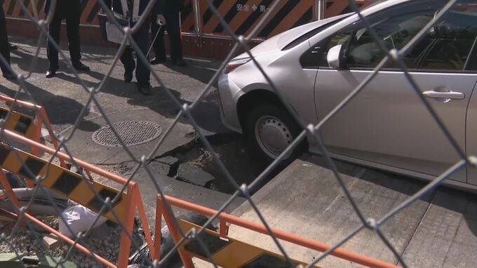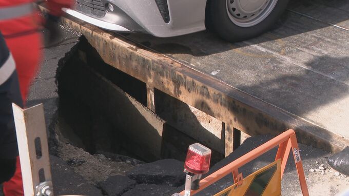 道路には縦1メートル、横2メートル、深さ1メートル余りの穴が開いていて、乗用車の前輪がはまりましたが、運転手の男性にケガはないということです。