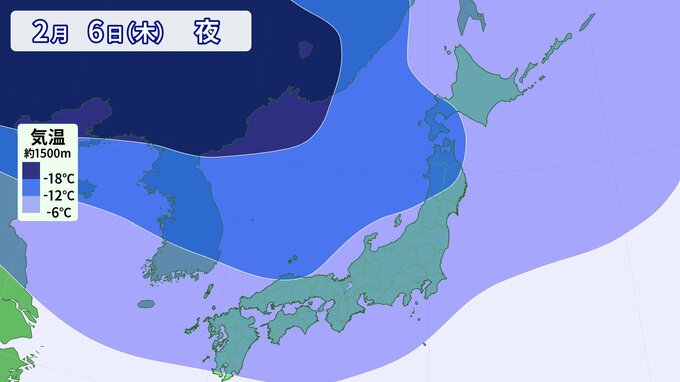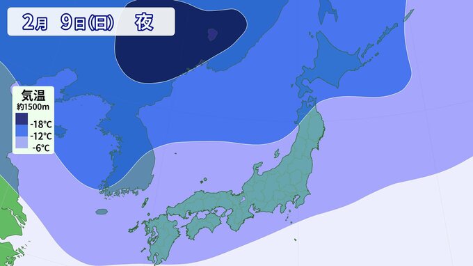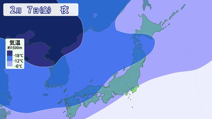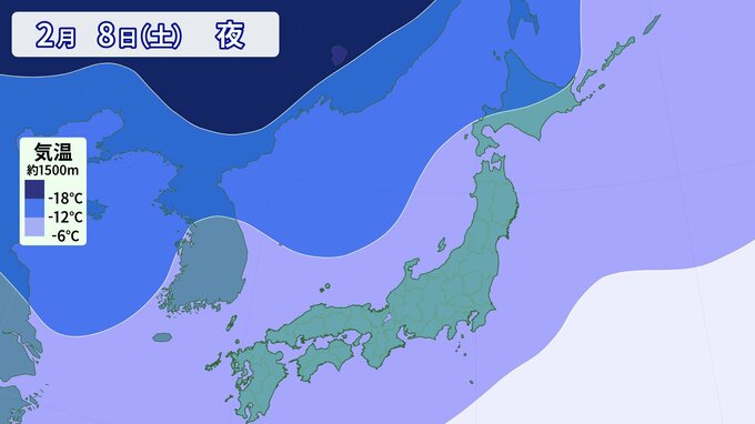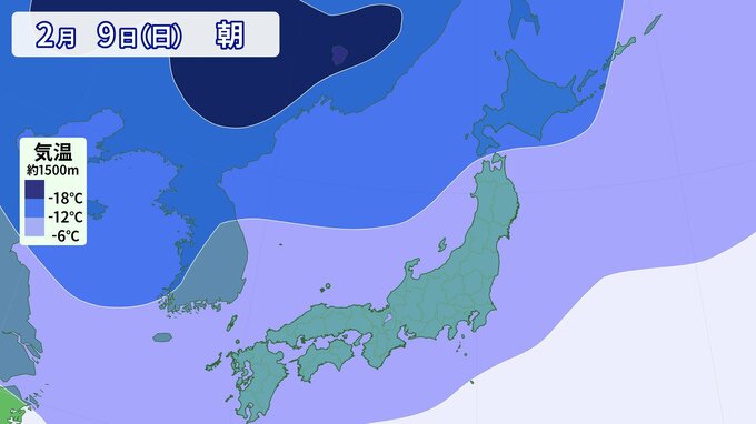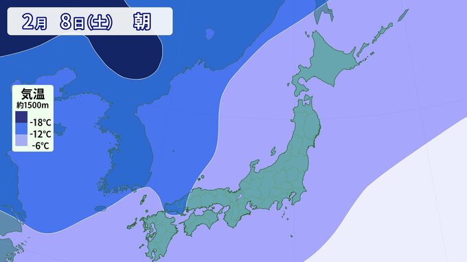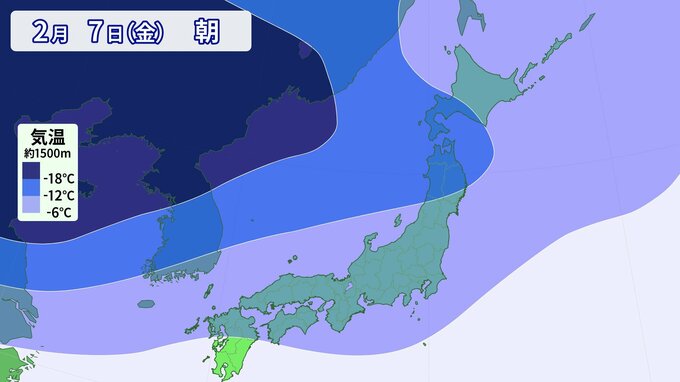 寒気の予想です。 上空1500m付近で-6℃以下の寒気は、平地でも雪が降る目安の寒気ですが、その寒気がすっぽりと日本列島を覆っています。 そして、今回の寒波は「長い」のが特徴で、週末まで日本の上空に居座る可能性があります。