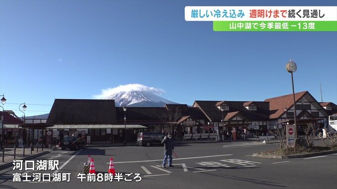 最低気温は山中湖で-13度、河口湖で-9度など、観測10地点のうち5地点で今シーズン最も低くなりました。甲府は-4.8度でした。