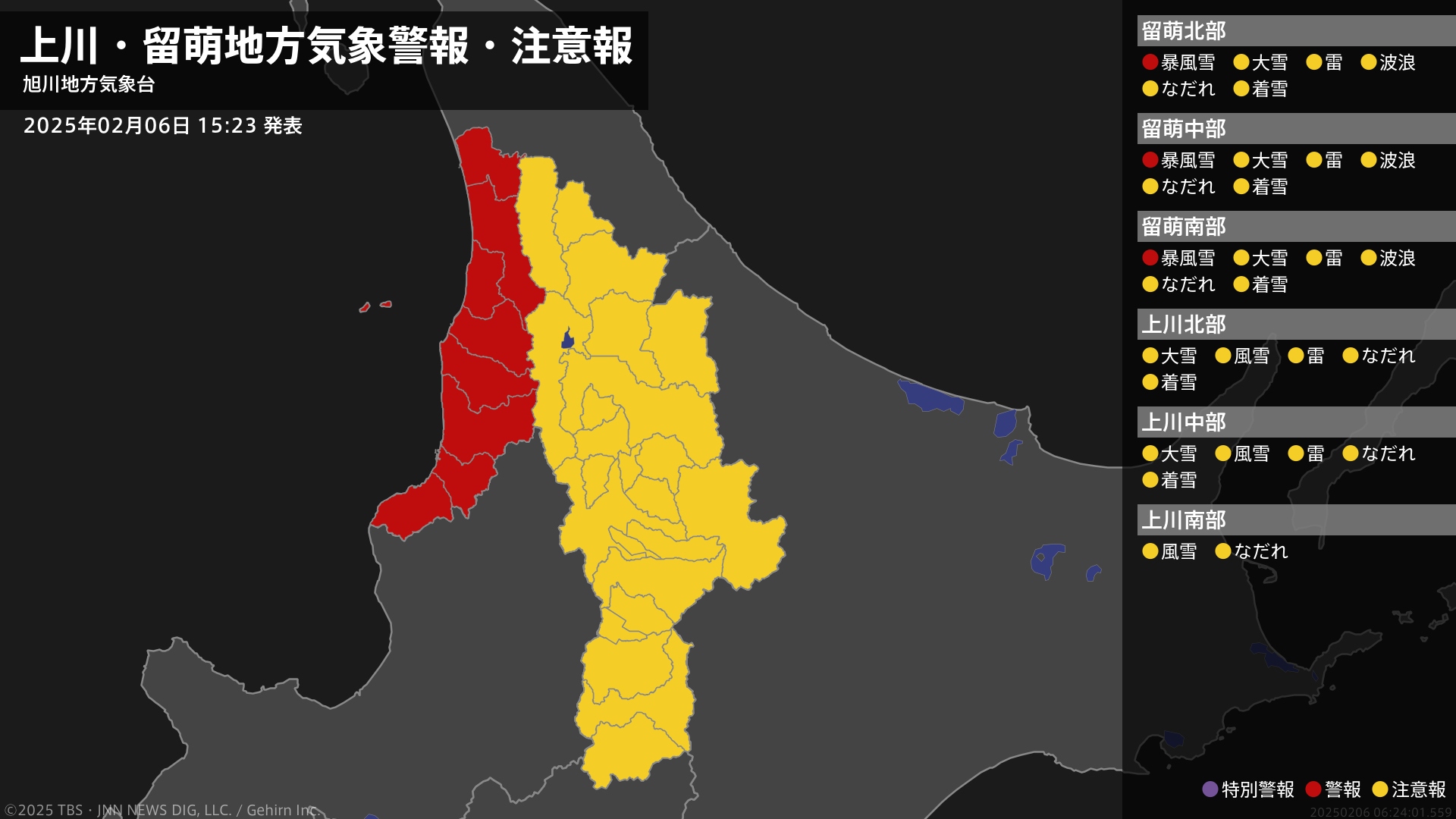 気象台は、午後3時23分に、暴風雪警報を留萌市、増毛町、小平町、苫前町、羽幌町、天売焼尻、初山別村、遠別町、天塩町に発表しました。