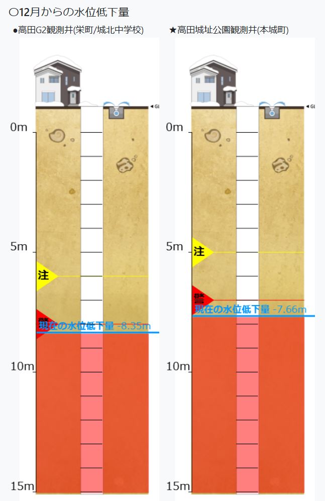 高田城址公園の観測井 -7.64m(警報報発令基準値 -7m)
