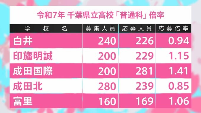千葉県立高校入試2025 全日制普通科 志願倍率は東葛飾2.17倍、船橋1.92倍、薬園台1.68倍に【令和7年度高校受験】 TBSテレビ 2025年2月6日(木) 19:01 国内 学校別の一覧 成田国際1.41倍、四街道1.34倍