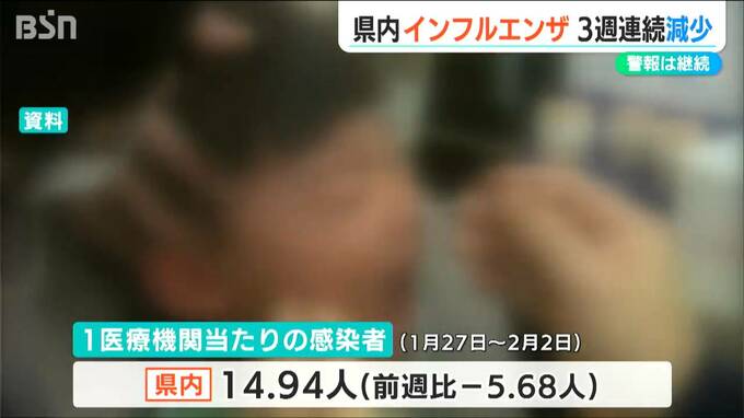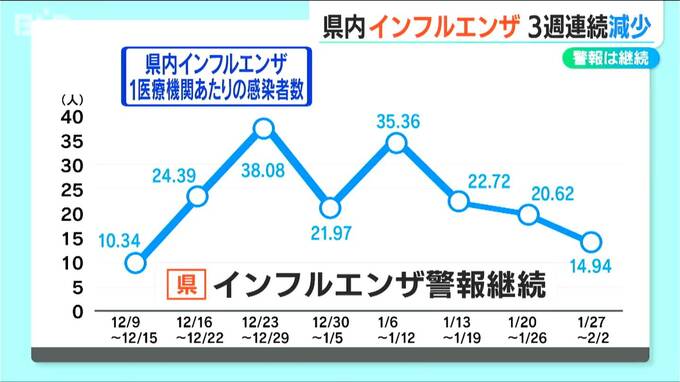 先月13日から3週続けて感染者が減少していますが、県はインフルエンザ警報解除の基準となる1医療機関あたり10人を下回るまで警報を継続するとしています。