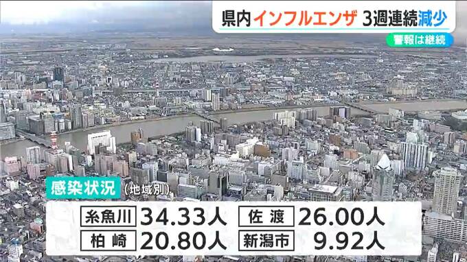 新潟県内で確認されたインフルエンザの感染者数は3週続けて減少となりました。ただ、依然として警報解除の基準には至っておらず県が感染対策の徹底を呼びかけています。