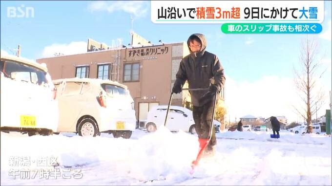 この冬一番の寒波の影響は6日も続き新潟県の山沿いでは積雪が3メートルを越えました。9日にかけて平地でも大雪となるところがある見込みで引き続き警戒が必要です。山沿いを中心に連日大雪が続く県内。【記者リポ…