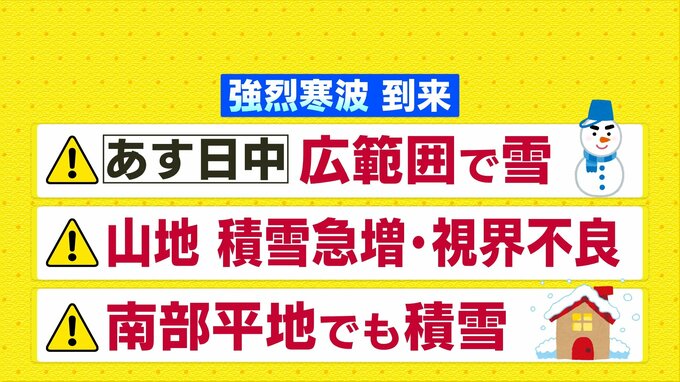 あすは上空に新たに強い寒気が流れ込み、日中は広い範囲で雪が降るでしょう。沿岸部ではみぞれや雨になる可能性もあります。特に芸北の山地では昼前から夜のはじめ頃にかけて警報級の大雪になる可能性が高くなっています。山地では積雪の急増や視界不良に警戒してください。南部の平地でも積雪する可能性があります。少しの雪でも路面が凍結する恐れがあるので、引き続き十分注意が必要です。