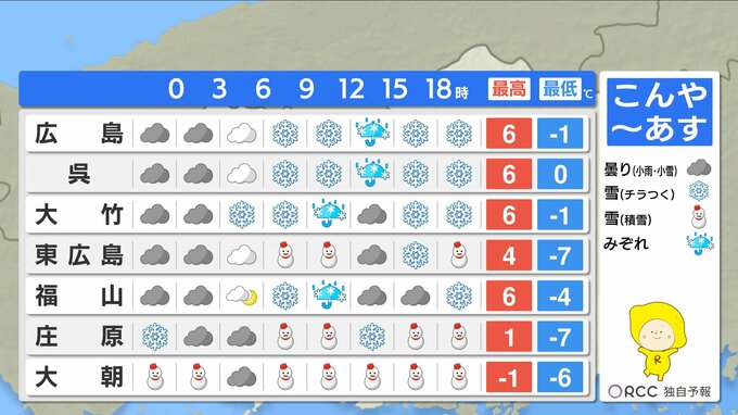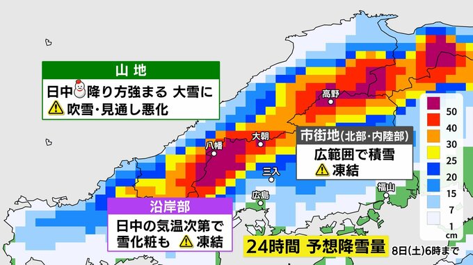 7日(金)日中は再び広範囲で雪に 芸北山地では大雪に警戒 南部平地でも積雪の可能性