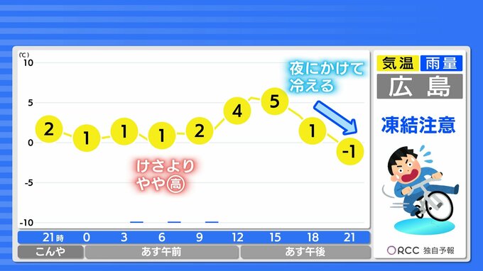 きょう6日(木)の広島県内は、昨夜~けさにかけて各地で積雪しました。広島市内でも午前3時・4時に積雪2センチを観測しました。そして各地で夜間の冷え込みが厳しくなり、最低気温は県内すべての観測地点で氷点下となりました。