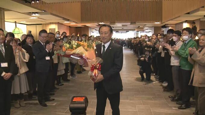 6日午前9時半ごろ、岐阜県庁に到着した江崎新知事は、職員ら約700人に拍手で迎えられ、花束が贈呈されました。