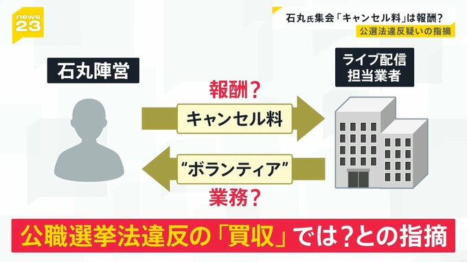 つまり、業者側に支払ったキャンセル料は、実質的に「報酬」となるおそれがあり、その場合、ボランティアの配信活動は「業務」にあたり、公職選挙法違反の「買収」ではないかと指摘されているのです。