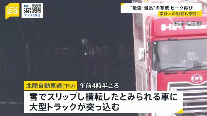 こうしたなか、雪の影響とみられる死亡事故も起きています。きょう午前4時半ごろ、福井県敦賀市のトンネル内で、雪でスリップし、横転したとみられる車に大型トラックが突っ込む事故がありました。