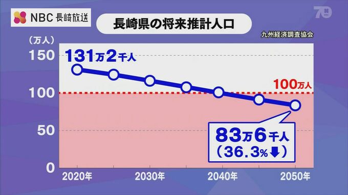 長崎県の『人口減少』が、国の研究所の予想よりも“早く進む”との予測を九州経済調査協会が発表しました。九州経済調査協会は、現在およそ131万人の長崎県の人口について、2040年には100万人を切り、2050年には83…