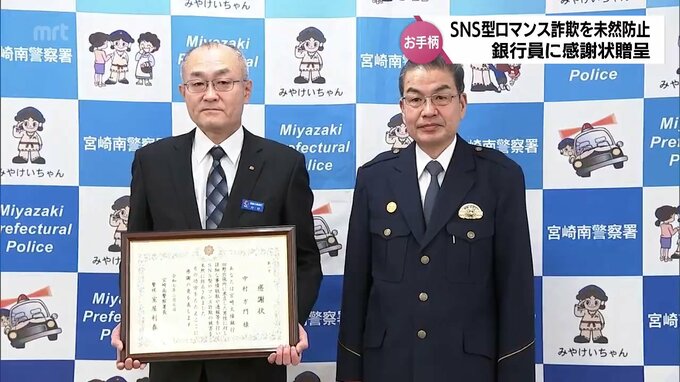 SNS型ロマンス詐欺の被害を未然に防いだとして、宮崎市の銀行員に警察から感謝状が贈られました。宮崎南警察署から感謝状が贈られたのは、宮崎市田野町の宮崎太陽銀行田野出張所に務める中村方門さん(63歳)です。…