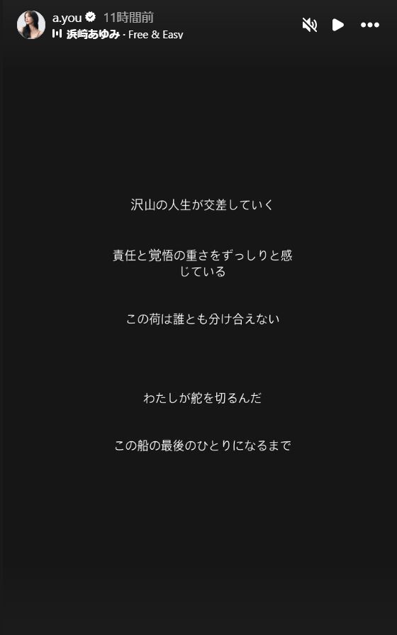 歌手の浜崎あゆみさんが自身のインスタグラム・ストーリーズに、決意の言葉を投稿しました。