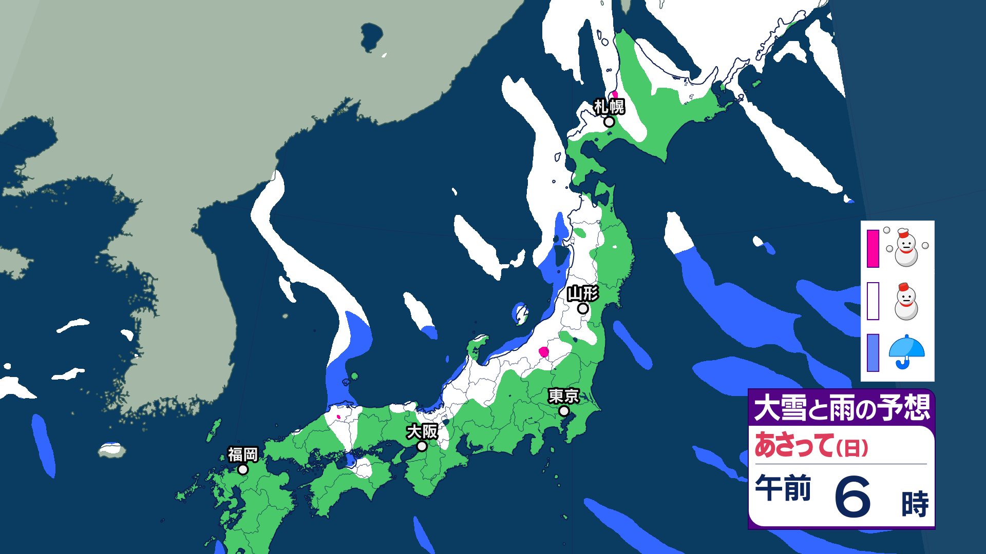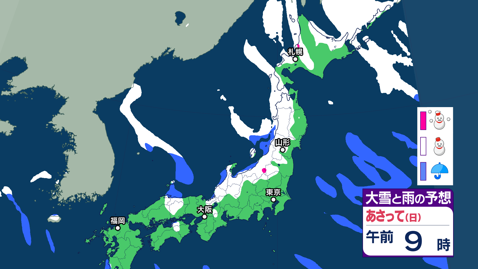 大雪情報 雪が降るのはいつ・どこで?【降雪シミュレーション】寒波襲来 北日本から西日本では9日にかけて大雪に警戒 24時間予想降雪量は東北・北陸地方で80センチ 東北・山形の天気どうなる 気象庁 テレビユー山形 2025年2月7日(金) 15:30 国内 ■9日(午前)の雪と雨の予報