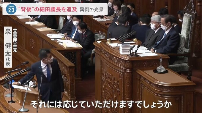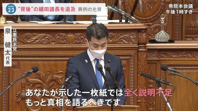 衆議院の本会議で、議長が追及される異例の光景が…。立憲民主党の泉代表は、細田衆院議長に対し、旧統一教会との関係について「説明不足だ」と質しました。一方、長男の総理秘書官起用について問われた岸田総理は「適材適所の観点から判断した」と答弁。自民党議員からは「空気が読めない」との声も上がっています。