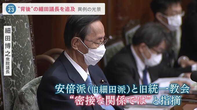 後ろの議長席を振り返ります。細田博之衆院議長がかつて会長を務めていた安倍派と、旧統一教会が密接な関係にあるのではないかと指摘しました。