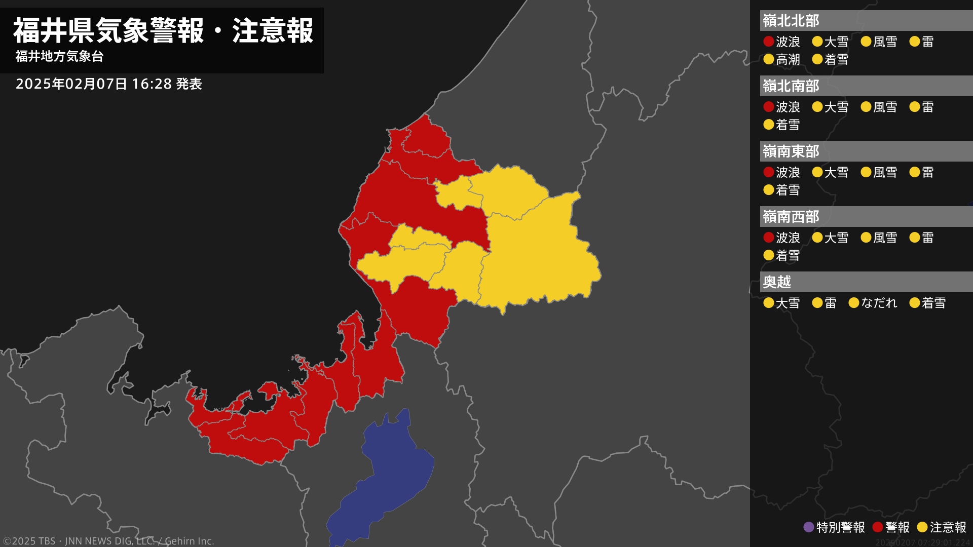 気象台は、午後4時28分に、波浪警報を福井市、敦賀市、小浜市、あわら市、坂井市、南越前町、越前町、美浜町、高浜町、おおい町、若狭町に発表しました。またなだれ注意報を大野市、勝山市に発表しました。