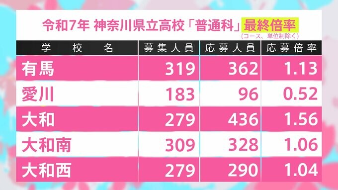 神奈川県立高校入試2025 全日制普通科 最終志願倍率は横浜翠嵐2.04倍、新城1.84倍、多摩1.67倍に【令和7年度高校受験】 TBSテレビ 2025年2月7日(金) 19:38 国内 学校別の一覧 大和1.56倍、座間1.32倍