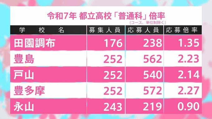 東京都立高校入試2025 全日制普通科 志願倍率は日比谷2.01倍、西1.60倍、国立1.56倍に【令和7年度高校受験】 TBSテレビ 2025年2月7日(金) 20:46 国内 学校別の一覧 豊多摩2.27倍、豊島2.23倍