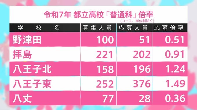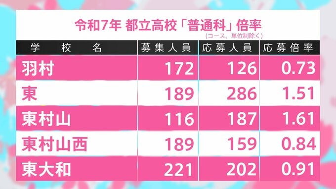 東京都立高校入試2025 全日制普通科 志願倍率は日比谷2.01倍、西1.60倍、国立1.56倍に【令和7年度高校受験】 TBSテレビ 2025年2月7日(金) 20:46 国内 学校別の一覧 東村山1.61倍、西1.60倍