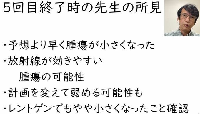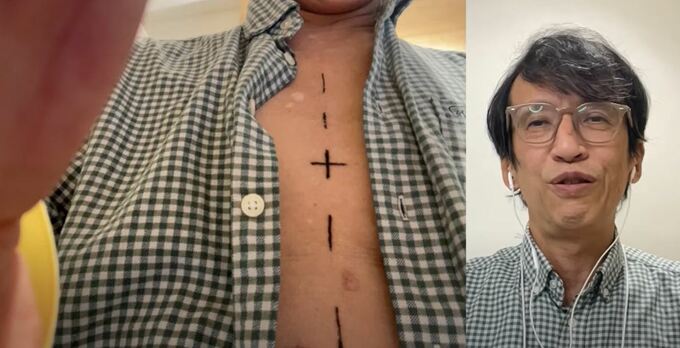 そして三上さんは、自身の身体に引かれたマーカー線を紹介して放射線治療についても説明。 ”左側が腫瘍の部分で、真ん中のところがリンパ節の部分で、ここに当てていっています。毎日やってます” ”毎日10分間ここにいるというだけの、非常に単純なもの” としつつ、放射線治療5回目終了の時点で、担当医からは ”予想よりも早くこの腫瘍が小さくなっている” との所見があったとのこと。副作用に配慮して、今後は放射線の出力を弱める可能性もあるとして、 ”非常にいい感じで進んでいる” と三上さんは語っています。
