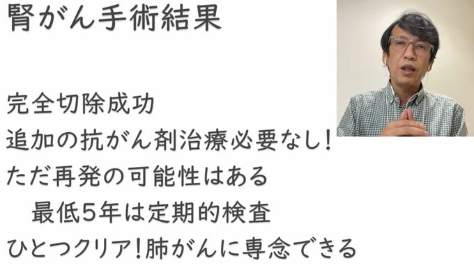 そして ”追加の抗がん剤の治療は必要ありません” と担当医に言われたとして、 ”懸案だった2つのがんのうち、1つは切った。本当に気楽になっています。これで肺がんの治療に専念できる” と、テキパキと自身の状況を解説しています。
