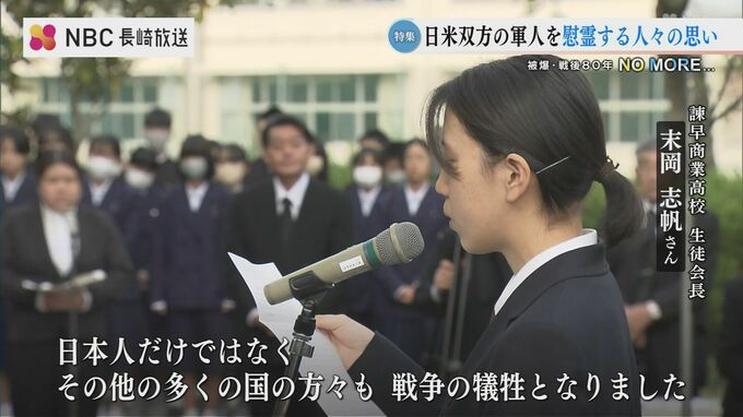 (諫早商業高校生徒会長 末岡志帆さん)「日本人だけではなく、その他の多くの国の方々も戦争の犠牲となりました。この慰霊碑に祀られているのもアメリカの方々です。」
