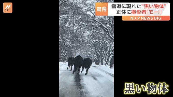 雪が積もるなか、車道に突然現れた“黒い物体”。その正体は意外な動物でした。