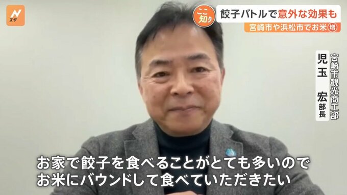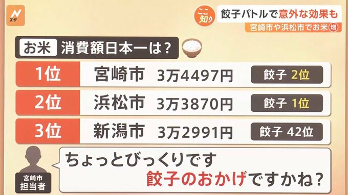 宮崎市は前年33位なので、大きくランクアップしています。宮崎市の担当者は「ちょっとびっくりです。餃子のおかげですかね?」と話していました。