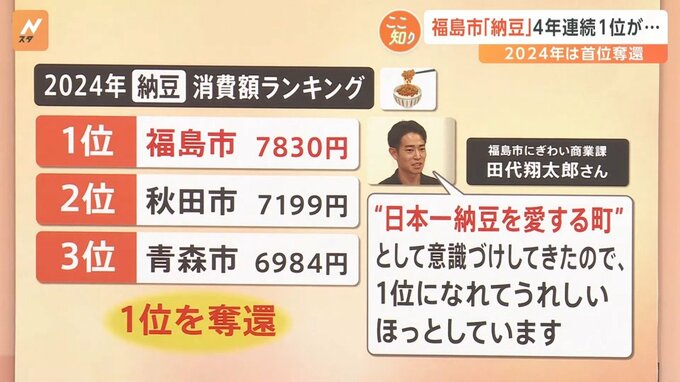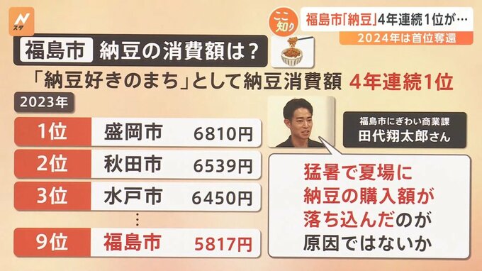 また、「納豆好きの町」として福島市は納豆の消費額が4年連続で1位だったのですが…2023年は9位に転落しました。