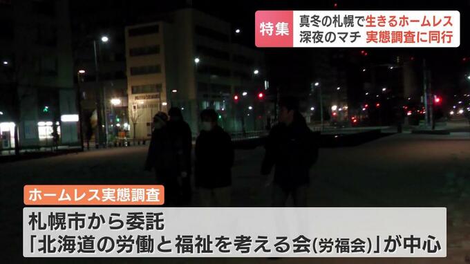 札幌市から委託を受けて行う、ホームレスの実態調査です。中心メンバーは、ホームレスの支援を行うボランティア団体『北海道の労働と福祉を考える会』、略して『労福会』です。