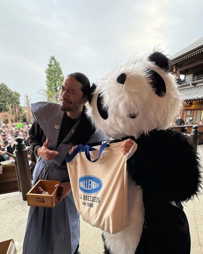 長瀬さんは、もはやトレードマークとなったロングヘアをひっつめにして額を大きく出し、肩衣に袴をまとった裃姿で大きな豆の升を鷲づかみにしています。さらに長瀬さんの隣にはパンダのキャラクターが、長瀬さんが関わるブランド「CHALLENGER」のトートバッグを抱えています。