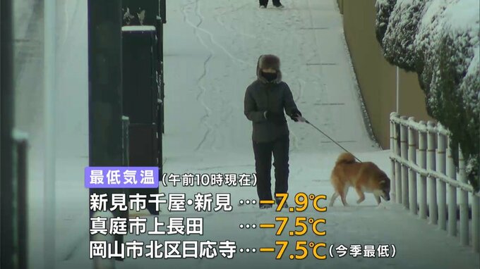 最低気温は、新見市千屋などで-7.9℃、真庭市上長田や岡山市北区の日応寺で-7.5℃となるなど氷点下の厳しい冷え込みとなりました。