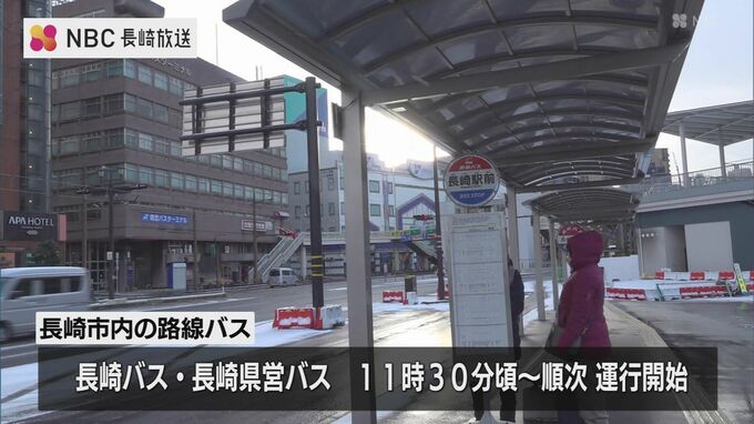 雪の影響で、長崎市内の路線バスは全線運行見合わせが続いていましたが、長崎バスと長崎県営バスともに午前11時30分頃から順次運行を開始しています。