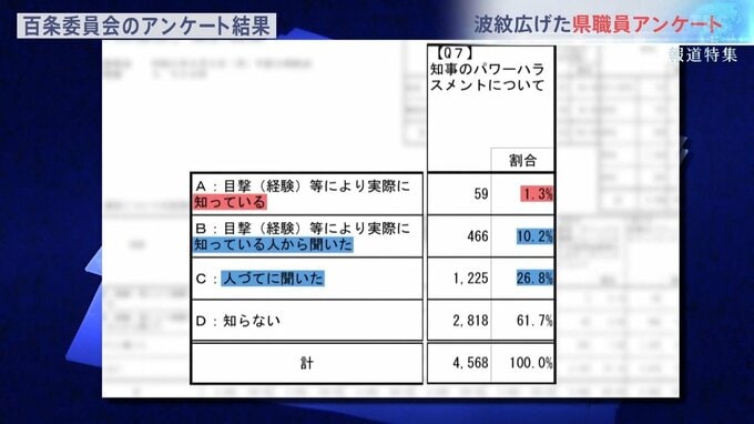 県職員およそ9700人を対象に行われたアンケート結果は、斎藤知事のパワハラについて「目撃などにより実際に知っている」「実際に知っている人から聞いた」「人づてに聞いた」など経験の申告から伝聞まで内容の信ぴょう性はさまざまだった。
