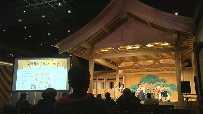 一方、能楽堂ホールtenjin9では地元アーティストのライブステージが開催され、岡山市東区西大寺で活躍する和太鼓、津軽三味線、沖縄三線のトリオ「和太鼓仲間トーチカ絃氣会」など10組がパフォーマンスを繰り広げました。