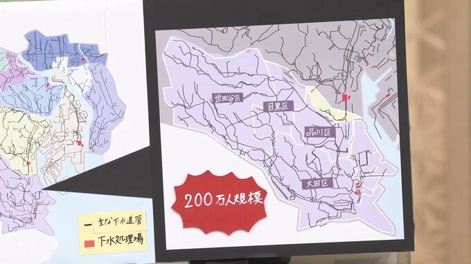 23区の東側の区分で今回と同様に、下水処理場に近い所で下水道の破損が起きた場合、世田谷区・目黒区・品川区・太田区の大部分が含まれ、200万人規模に影響が及ぶ可能性があるといいます。